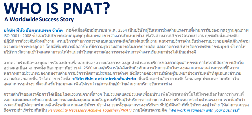 บริษัทฯ เป็นผู้นำในการเชื่อมโยงแรงงานจากที่ต่างๆ ในประเทศไทยด้านการพัฒนาขีดความสามารถตามระดับความรู้หรือทักษะของแต่ละบุคคล เพื่อให้เขาเหล่านั้นได้มีทางเลือกในการทำงานที่เหมาะสมและตรงกับความต้องการของแต่ละบุคคล และในฐานะที่เป็นผู้ให้บริการทางด้านการจ้างงานรับเหมาช่วงในด้านแรงงาน เรามั่นใจว่า เราจะเป็นผู้ให้ความช่วยเหลือทั้งพนักงานของบริษัทฯ ผู้ว่าจ้าง รวมทั้งบุคลากรของบริษัทฯ ที่ปฏิบัติหน้าที่ที่บริษัทของผู้ว่าจ้าง สามารถบรรลุถึงความเป็น Personality Necessary Achieve Together (PNAT) ภายใต้แนวความคิด "คิดถึงซับคอนแทรค คิดถึงเรา"